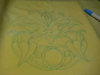 Amikor ezt a fázist letudtam, akkor hosszasan nézegettem a mintát, hogy honnan is induljak el, hogy merre is haladjak majd a cérnámmal. A tűzésben az a csodálatos, hogy a vonalak - a kelta mintákhoz hasonlatosan - egy folyamatos vonalat adnak, így a tű felemelése nélkül rajzolódik ki a művünk. Természetesen van ahol vissza kell majd menni egy meglévő varraton, de akkor (mivel ott két cérnavonal fog keletkezni) dupla szál is fog látszani. Ez volt az oka a hosszú perceknek, amit a nézegetéssel eltöltöttem. De egy idő után feladtam :-(